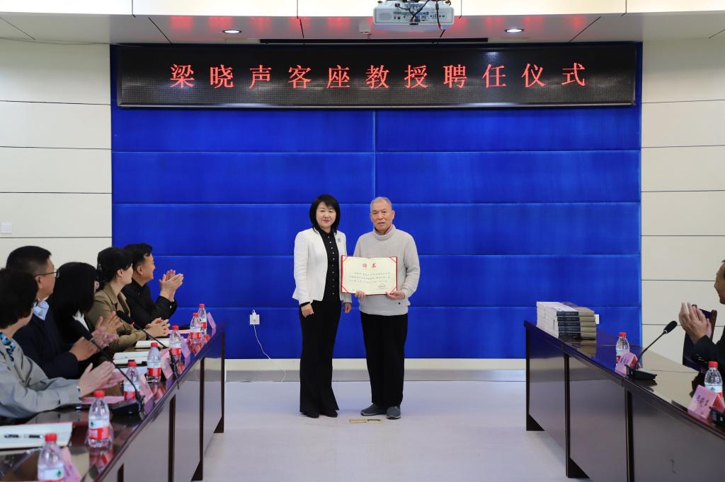 杨其滨介绍了梁晓声先生的创作经历。于文秀为梁晓声颁发HG8088皇冠中国现当代文学客座教授聘书。