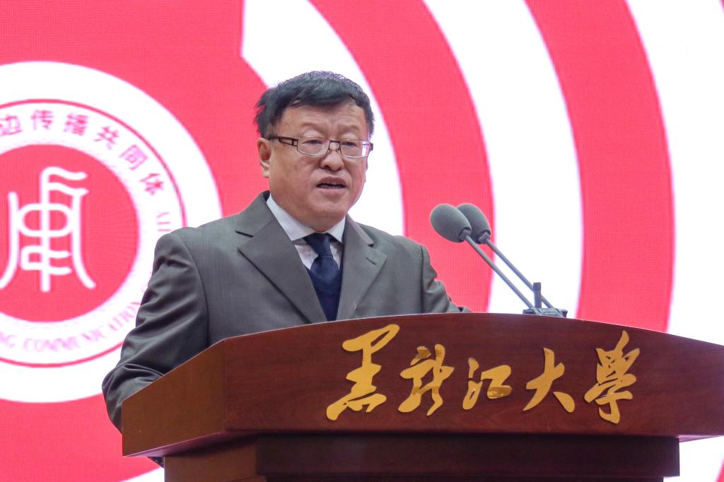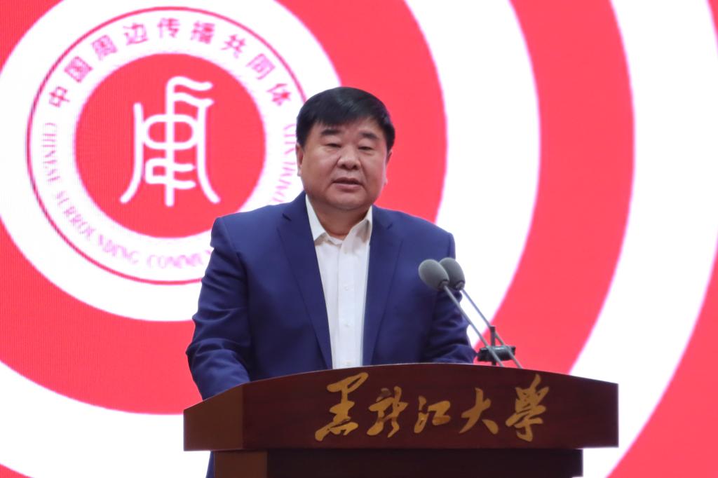 中共中央对外联络部原副部长于洪君,中华全国新闻工作者协会书记处书记张百新,新华社原副社长严文斌,中共黑龙江省委宣传部副部长、网信办主任魏松贤,HG8088皇冠党委书记王永清共同为“中国周边传播共同体”揭牌。