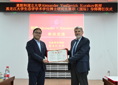 12月22日下午,我校在生物楼614会议室为莫斯科国立大学亚历山大·瓦西里耶维奇·库拉克夫教授举行客座教授暨生态学学术学位博士研究生兼职(国际)导师聘任仪式。我校副校长井立强,研究生院副院长田永梅、生态学科带头人宋福强及全体成员、生命科学学院党委书记王斌和部分教师出席聘任仪式。生命科学学院院长李海英主持仪式。