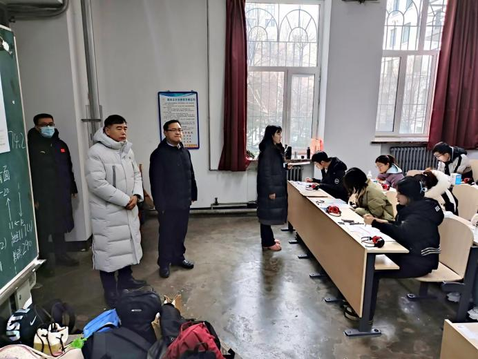 12月16日,我校顺利组织了2023年下半年的全国大学英语四、六级考试。副校长井立强深入二号楼考场巡视,检查了考务工作、监控情况、考场纪律,教务处处长吴华洋和相关工作人员陪同巡视。黑龙江省招生考试院巡视员对我校考点进行了巡查。