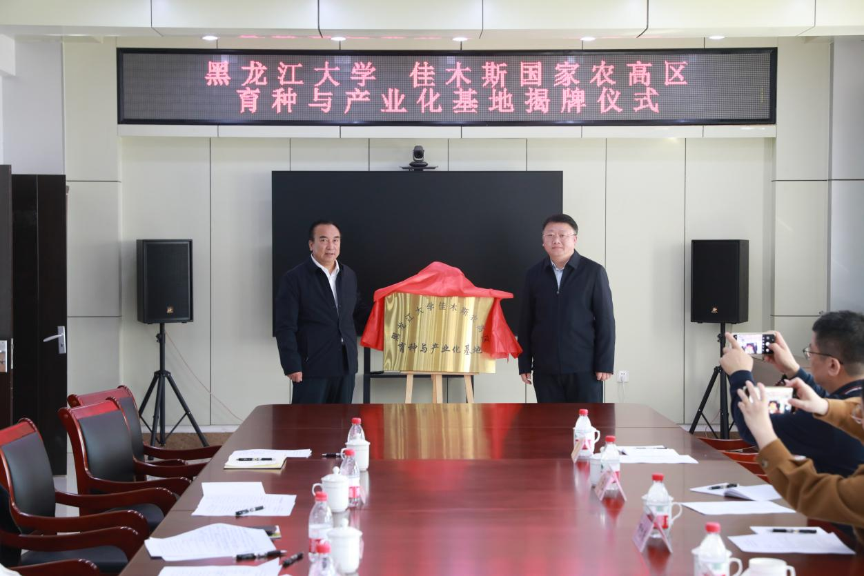 佳木斯农高区管委会副主任郭震、HG8088皇冠科学技术处处长赵晓锋为HG8088皇冠与佳木斯农高区育种与产业化基地揭牌。