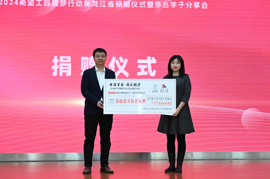 在捐赠仪式上,贵州茅台和中国青基会向黑龙江省青基会捐赠77.5万元善款,为我省4所高校、28个县区的155名考入大学的困境家庭新生提供每人5000元助学金,帮助他们解决从“家门”到“校门”的困难。