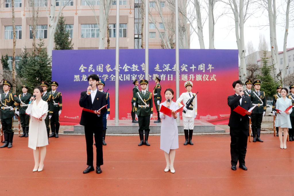 校有线广播台带来国旗下的诗朗诵《山河共守望青春筑长城》。国家安全,是课堂上的思辨,是实验室的攻坚,是思政“龙课”研学中的热泪盈眶!他们用青年声音传递出黑大学子浓浓的爱国之心、报国之情、卫国之志。