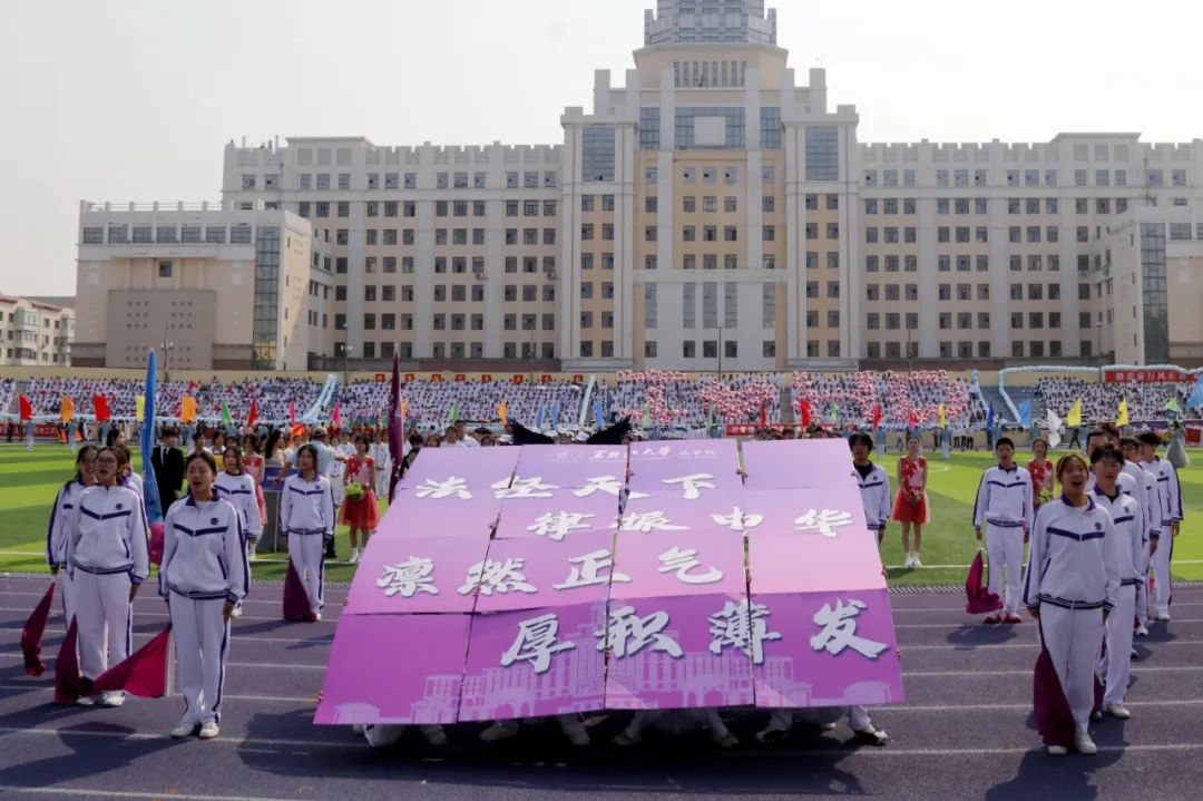 伴随着雄壮的国歌,鲜艳的五星红旗冉冉升起,全场师生肃立。在激昂的校歌声中,校旗、会旗相继升起,三面旗帜在体育场上空迎风飘扬。