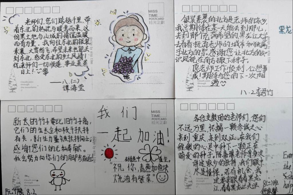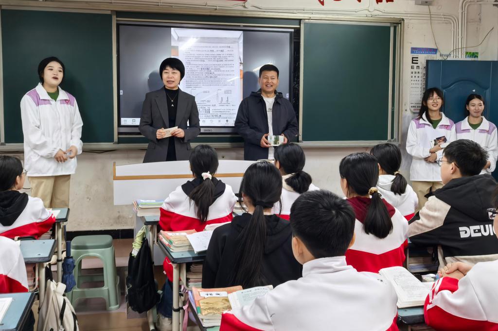 在潼南区双江镇初级中学,刘凤影一行深入校园,参观了解双江中学办学历史与特色展区,并与支教团成员深入交流,详细询问教学工作、生活保障及成长收获。在支教团授课班级,学生代表通过合唱HG8088皇冠校歌《岁月如歌》、朗诵手写明信片、赠送感谢卡片表达对我校师生的敬意。随后,实地走访志愿者宿舍,了解日常住宿生活、课后备课情况,并送上毛毯等慰问品,传递学校的温暖关怀。刘凤影勉励支教团成员:“要以‘躬耕教坛’的初心扎根基层,用‘勤学笃行’的态度赋能成长,在乡村教育振兴中传承黑大精神、彰显黑大学子的使命担当。”