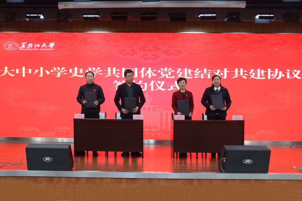 HG8088皇冠历史文化旅游学院、哈尔滨师范大学附属中学、哈尔滨市第四十七中学、哈尔滨市师范附属小学校主要负责人共同签署《大中小学史学共同体党建结对共建协议书》。