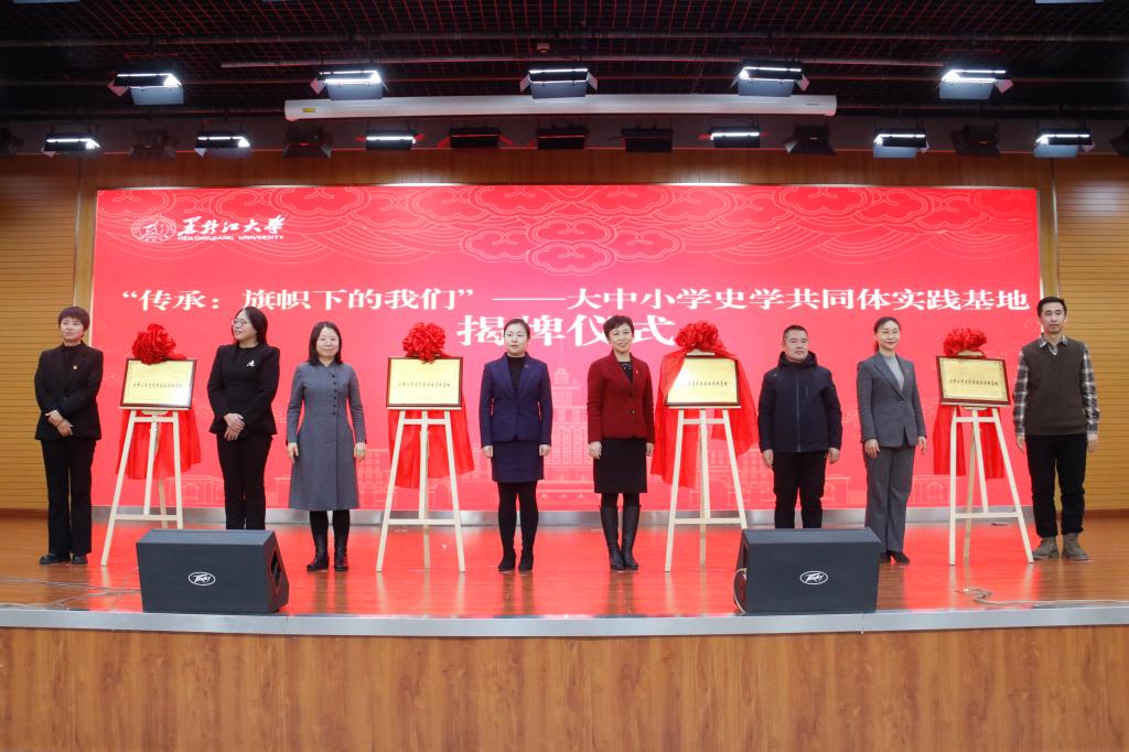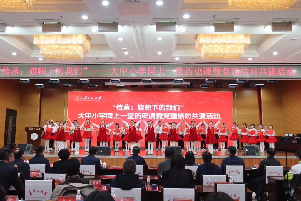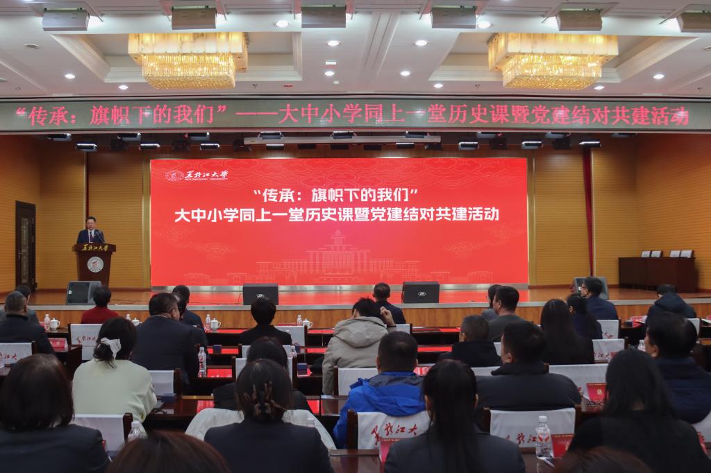 12月12日下午,由HG8088皇冠主办,HG8088皇冠历史文化旅游学院、哈尔滨师范大学附属中学、哈尔滨市第四十七中学、哈尔滨市师范附属小学校承办的“传承:旗帜下的我们”——大中小学同上一堂历史课暨党建结对共建活动在我校主楼一楼报告厅举行。校党委书记迟宝旭,校党委副书记李君明,副校长魏影,哈尔滨市教育局、哈尔滨市南岗区教育局、协办单位主要负责人以及四所学校师生代表参加活动。活动由李君明主持。