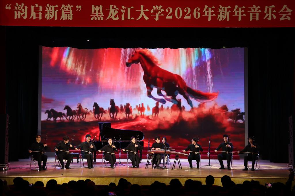 室内乐合奏《春节序曲》《太阳岛上》通过错落有致的声部勾勒出红火团圆的新春图景,又用和谐融洽的旋律描绘出哈尔滨夏日的惬意画面,将东方情愫与西洋室内乐巧妙融合,为现场师生带来别样的视听盛宴。男声二重唱《跟你走》情真意切,唱响了黑大人扎根黑土、同心奋进的执着信念与坚定使命。二胡重奏《赛马》节奏铿锵,以骏马奔腾的豪迈意象与奋进昂扬的旋律,呼应辞旧迎新、喜迎丙午马年的热切期盼。