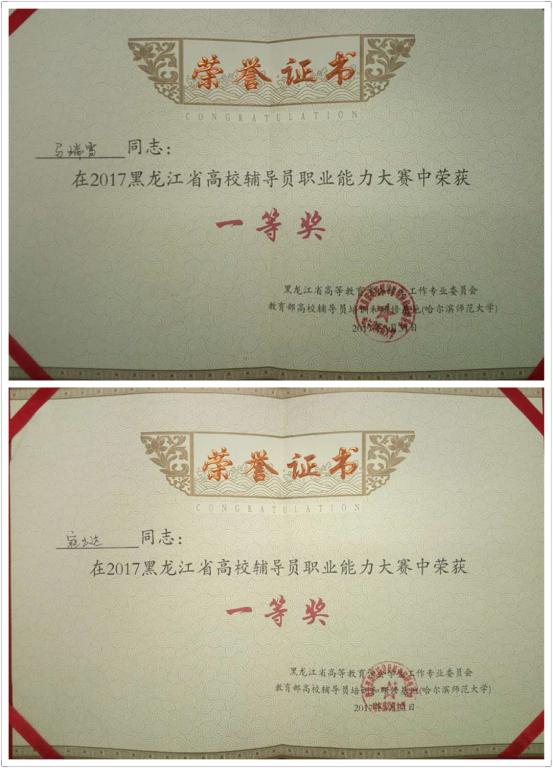 3月31日,由黑龙江省委高校工委宣传部、黑龙江省教育厅思政处指导,教育部高校辅导员培训和研修基地(哈尔滨师范大学)主办的2017黑龙江省高校辅导员职业能力大赛决赛在哈尔滨师范大学落下帷幕。我校计算机科学技术学院、软件学院辅导员马瑞雪、建筑工程学院辅导员寇玉达分获大赛前两名,喜获一等奖。至此,我校辅导员已连续六年获得该项赛事全省一等奖。