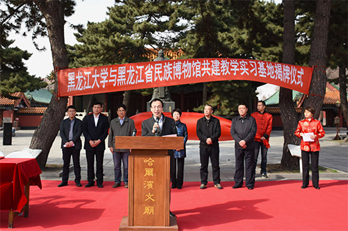 我校王司瑜副校长在仪式上致辞。他介绍了学校历史文化旅游学院考古学专业、国学院的成立及发展情况,对省文化厅、省民族博物馆的各位领导及专家对学校发展给予的关注和支持表示衷心感谢。他指出,黑龙江省民族博物馆不仅是东北地区民族文物收藏展示的第一大馆,也是东北地区最大的文庙,是民族文化遗产保护还是国学推广及传统文化教育的重要平台,也是我校历史学、考古学开展实践的重要场所。此次签约是对以往校馆合作的阶段性总结,也是新的合作的开始。随着合作的深入开展,我们一定可以共同为龙江文化发展事业培养更多的人才,为弘扬国学、加强中华优秀传统文化教育做出更大的贡献。