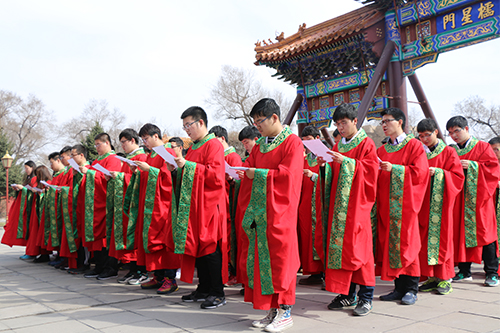 在仪式上,我校历史文化旅游学院的同学们还身着汉服,齐声朗诵国学经典诵读国学经典《论语》和《大学》选段。