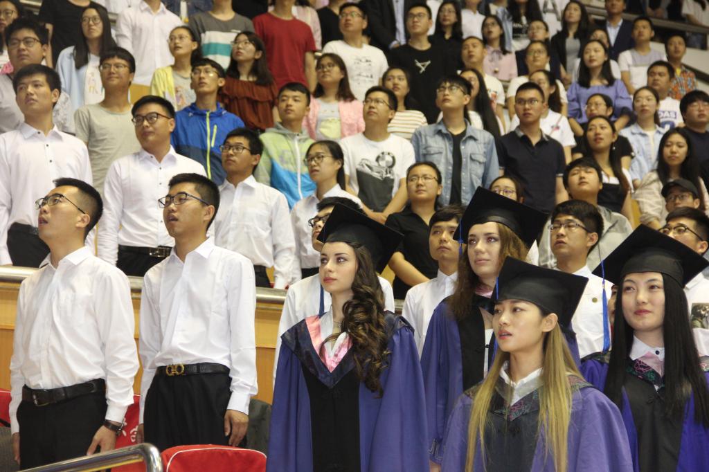 在雄壮的国歌和激昂的校歌中,国旗和校旗冉冉升起,2017届毕业生毕业典礼正式开始。