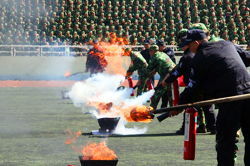 9月6日上午,我校在体育场进行2017级学生军训消防演练,旨在提升在校大学生消防安全素质,夯实校园消防安全基础,减少火灾危害,创造良好的社会消防安全环境。