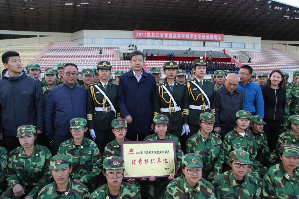 各项军训成果展示结束后,大会对2017黑龙江省普通高等学校学生军训成果展示优秀组织单位、先进承训部队进行了表彰,我校受到大会的表彰,被授予“2017黑龙江省普通高等学校学生军训成果展示优秀组织单位”。最后,省政府副秘书长邢爱国、省军区副司令员邱月潮少将分别做了讲话。