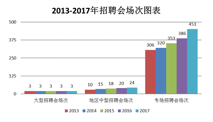 近五年学校通过“走出去,请进来”积极开拓省内外就业市场,以“优质服务和优秀的毕业生质量”创出HG8088皇冠品牌,彰显学校影响力。市场区域分布结构更科学,地区覆盖珠三角经济区、长三角经济区、长江经济带、渤海湾京津冀经济区、沿海开放城市,尤其江苏省、浙江省各区市,连续12年到校招聘。招聘会层次更多元,学校每年精心组织召开大型、中型、专场、行业和校友招聘会,年招聘会场次达470余场。招聘岗位更充足,从2013年的年招聘岗位24658增长到2017年35867,供需比达1:4。招聘单位质量更优质,招聘单位国企占比由2013年的252家增长为2017年360家,民营企业从1 023家增长到1681家。知名企如碧桂园、58同城、中粮集团、IBM、亨通集团、恒大集团、格力电器、哈飞集团、哈空调集团和朝阳企业如深圳卓越物业、大连金玛集团等逐年增多。