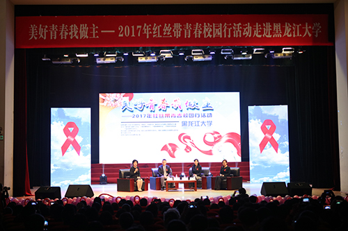 为了普及艾滋病防控知识,提升大学生的防艾意识,传递青春正能量,10月31日晚,由我校承办的“美好青春我做主”——红丝带青春校园行活动在我校音乐厅举行。中国性病艾滋病防治协会秘书长王新伦、共青团黑龙江委员会副书记陈凯云、黑龙江省性病艾滋病防治协会会长邢济春,省卫计委疾控处、省疾病预防控制中心、省教育厅体卫艺处等有关负责同志,红丝带健康大使鞠萍、沈娜,我校党委副书记丁宏、青年师生代表等共计1000余人参加了此次活动。