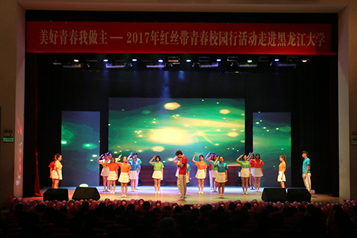 在活动中,我校学生表演了合唱《瞳孔里的太阳》,呼吁大家关注艾滋病,关爱艾滋病儿童;心理情景剧《用爱战胜爱》讲述了一名怀疑自己感染了艾滋病的同学的心理历程,宣传了艾滋病的传播途径及检测;《大梦想家》的手语操表演传递了温暖的力量;红丝带健康大使沈娜的一曲《我爱你,中国》更是让大学生们感受到了个人和祖国发展的密切关系,将现场气氛推向了高潮。同学们用精彩的文艺演出表达了对艾滋病防控的关注以及对生命的尊重。活动中还举行了黑龙江省高校“校园防艾宣传员”的聘任仪式,来自十所高校的10名学生成为了龙江高校群体防控艾滋的新生力量。