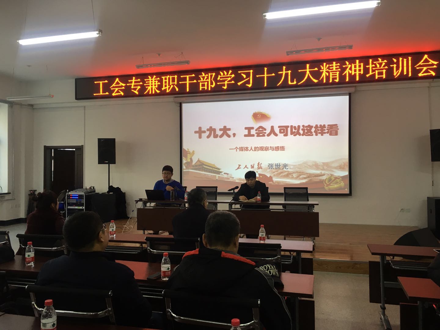 凝心聚力跟党走,不忘初心再出发。11月22日下午,我校在教职工之家举办工会专兼职干部学习十九大精神专题培训会。《工人日报》黑龙江记者站站长张世光作了题为《十九大,工会人可以这样看》的专题辅导讲座。校工会主席陈德明,各部门工会主席、副主席、部分工会委员及机关工会专职干部参加了培训。培训会由校工会副主席王军林主持。