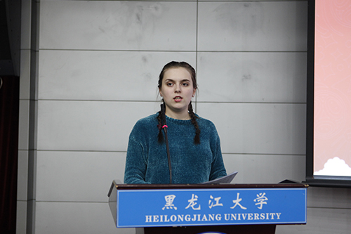 在中俄学生才艺展示和交流互动环节,同学们通过歌曲、舞蹈、诗朗诵、成语接龙等形式进行了友好交流。其中,中俄学院2016级朱政同学演唱了俄罗斯歌曲《Якоря》,俄罗斯留学生雅娜朗诵《木兰辞》,赢得了现场阵阵掌声。