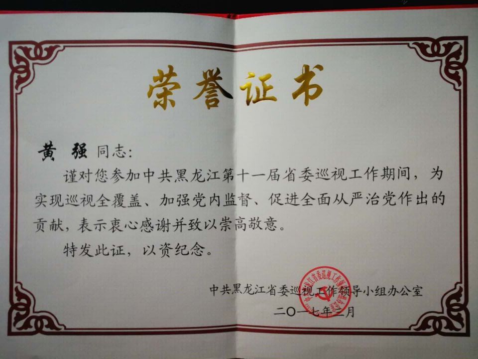 近日,中共黑龙江省委巡视工作领导小组办公室向我校下发了庞淑红、黄强两位同志的荣誉证书。2016年,我校纪委副书记庞淑红同志、国有资产管理处处长黄强同志先后被抽调巡视组挂职,参加了中共黑龙江第十一届省委巡视工作。在参加巡视工作期间,两位同志认真学习巡视工作理论,迅速进入工作角色,坚守各项纪律,充分发挥专业优势和自身特长,不遗余力完成各项工作任务,表现突出。省委巡视工作领导小组为表彰他们在加强党内监督、促进从严治党工作中做出的贡献,向他们颁发了荣誉证书。