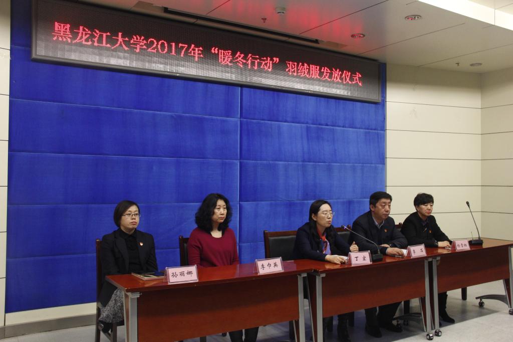 12月20日下午4时,我校在主楼A座226室举行2017年“暖冬行动”羽绒服发放仪式。校党委副书记丁宏,学工部部长李石、副部长李巾英、杨雪虹、孙丽娜,受助学生代表以及辅导员代表出席了发放仪式。本次活动是由哈尔滨美罗湾医院和北京青爱教育基金会共同发起,由哈尔滨美罗湾医院出资10万元为我校家庭经济困难学生购买羽绒服。