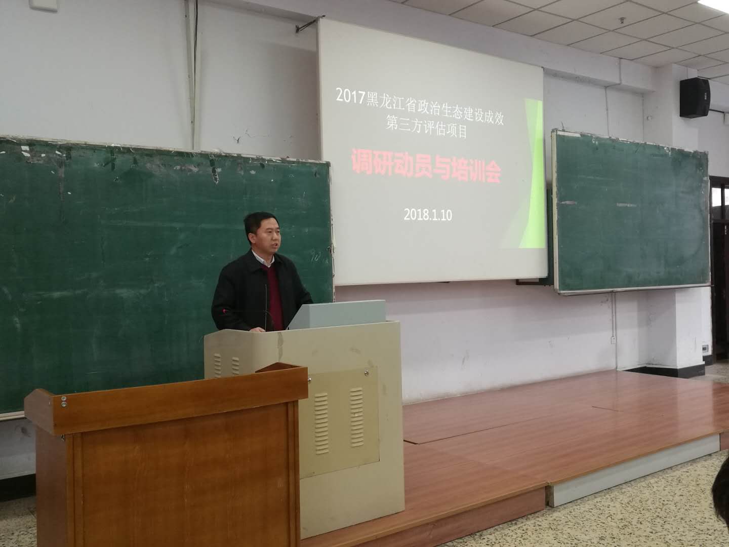 1月10日下午,黑龙江省政治生态建设成效考核第三方评估调研动员培训会在我校汇文楼120室召开。省纪委党风政风监督室主任丁国怀,工作人员张晓明,我校纪委书记荣盘祥,纪委办、监察处、政府管理学院相关负责人和100余名师生参加了培训会。