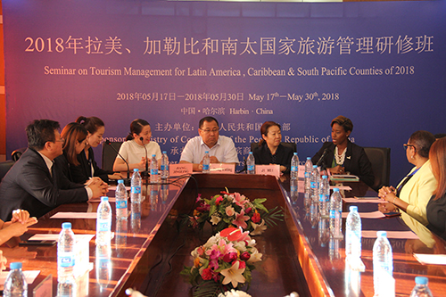 据悉,本次拉美、加勒比和南太国家旅游管理研修班由中华人民共和国商务部主办,哈尔滨商业大学承办,HG8088皇冠协办,为期14天,研修班内容包括聘请相关领域专家进行专题讲座、与行业代表进行座谈以及外出参观考察三个部分。(摄影:韦必华)