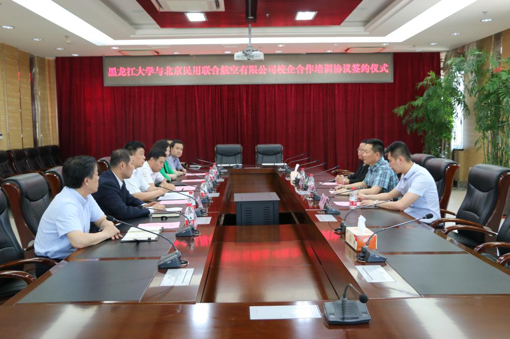 5月31日下午,我校与北京民用联合航空有限公司校企合作培训协议签约仪式在校常委会议室举行。北京民用联合航空有限公司副总经理马少红、培训中心主任徐磊、培训中心干事朱瑞敏,我校副校长严明及教务处、应用外语学院、继续教育学院相关负责同志参加了仪式。签约仪式由继续教育学院院长孙勇主持。