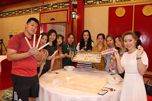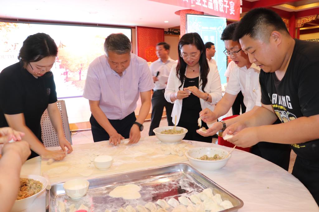宴会开始前,毕业生和各学院老师们围坐在一起,着手饺子宴的准备工作。我校饮食服务中心的师傅手把手教授毕业生们包饺子,毕业生们与老师亲自动手,共同和面、擀皮、包饺子,气氛热烈,热闹喜庆,浓浓的同学情、师生情在这一举一动中洋溢开来。
