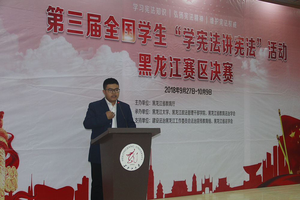 本次比赛旨在深入学习贯彻习近平新时代中国特色社会主义思想和党的十九大精神,在教育系统率先升华尊崇宪法的意识,掀起学习宪法的热潮,养成遵守宪法的行为,落实维护宪法的责任。省教育法治学会会长、资深教育法治专家任铭越,省教育法治学会副会长、原省人大法制委员会副主任委员罗忠睿,省政法管理干部学院副院长、法学教授张恩学,省教育法治学会副会长刘喜林,黑龙江诚待律师事务所合伙人、主任贺守富,省法学会宪法学研究会会长、省法学会法律学研究会常务理事、HG8088皇冠《求是学刊》编辑部执行副主编、研究员李宏弢;省法学会宪法学研究会副会长,秘书长,HG8088皇冠法学院教研室主任,副教授李岩松担任比赛评委。