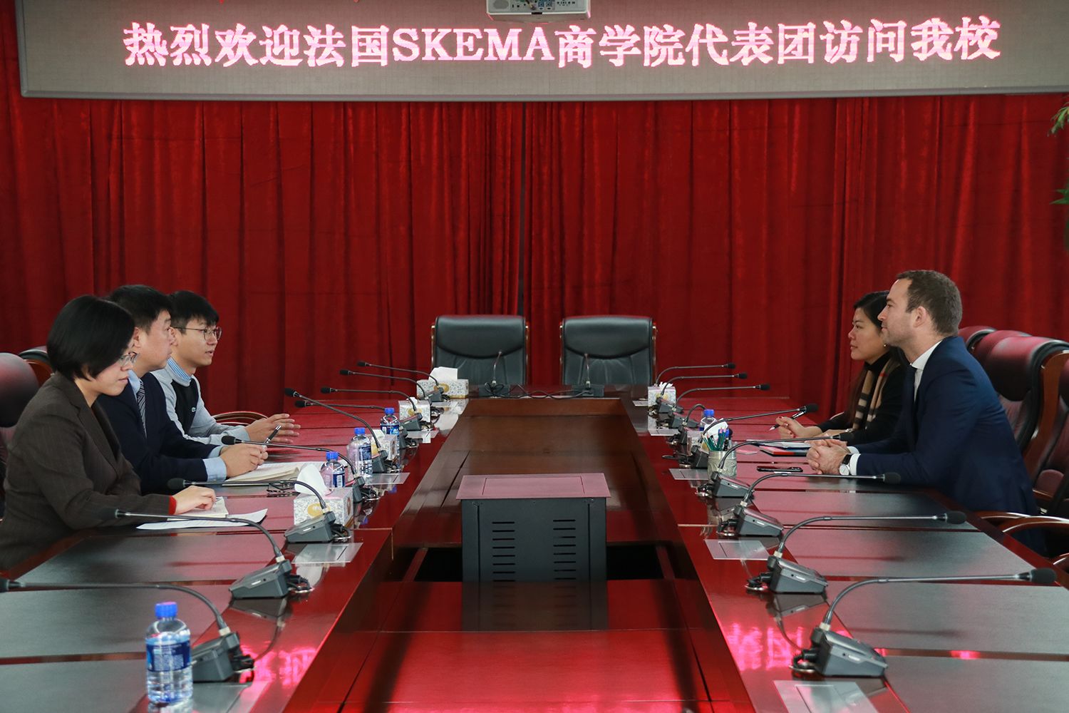 12月12日上午,法国SKEMA商学院中国校区校长Matthieu DUMONT一行访问我校,并与学校领导在主楼8楼会议室进行会谈。我校副校长严明、国际合作与交流处相关负责人等参加会谈。