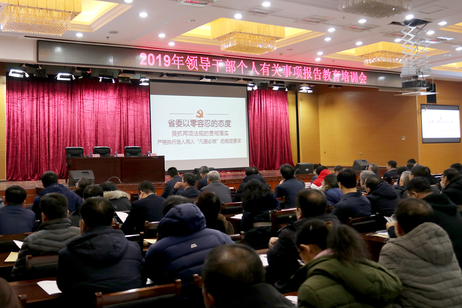 1月11日,我校主楼一楼报告厅召开2019年领导干部个人有关事项报告工作教育培训会,在校校领导及所有填报范围内的中层领导干部出席了会议,本次会议由党委副书记蒋晶洁同志主持。
