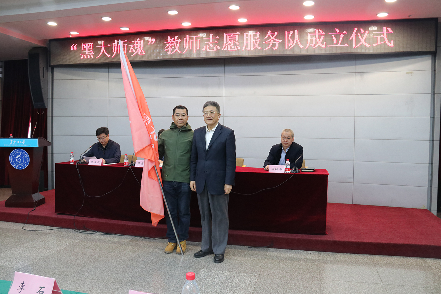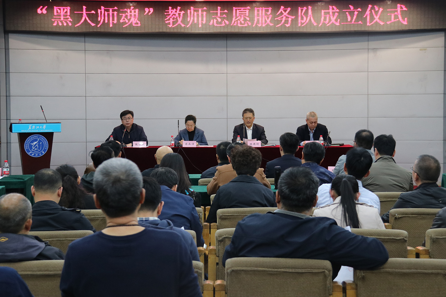 4月17日下午,我校在国际文化教育学院三号楼多功能厅举行“黑大师魂”教师志愿服务队成立仪式。校党委副书记蒋晶洁、校工会主席陈德明,教师工作部、宣传部、团委、工会、学工部、离退休工作处相关人员,各二级党组织、部门工会主要负责人,学院教师志愿服务队负责人,教师志愿者代表参加本次成立仪式。成立仪式由党委宣传部、统战部部长张学成主持。