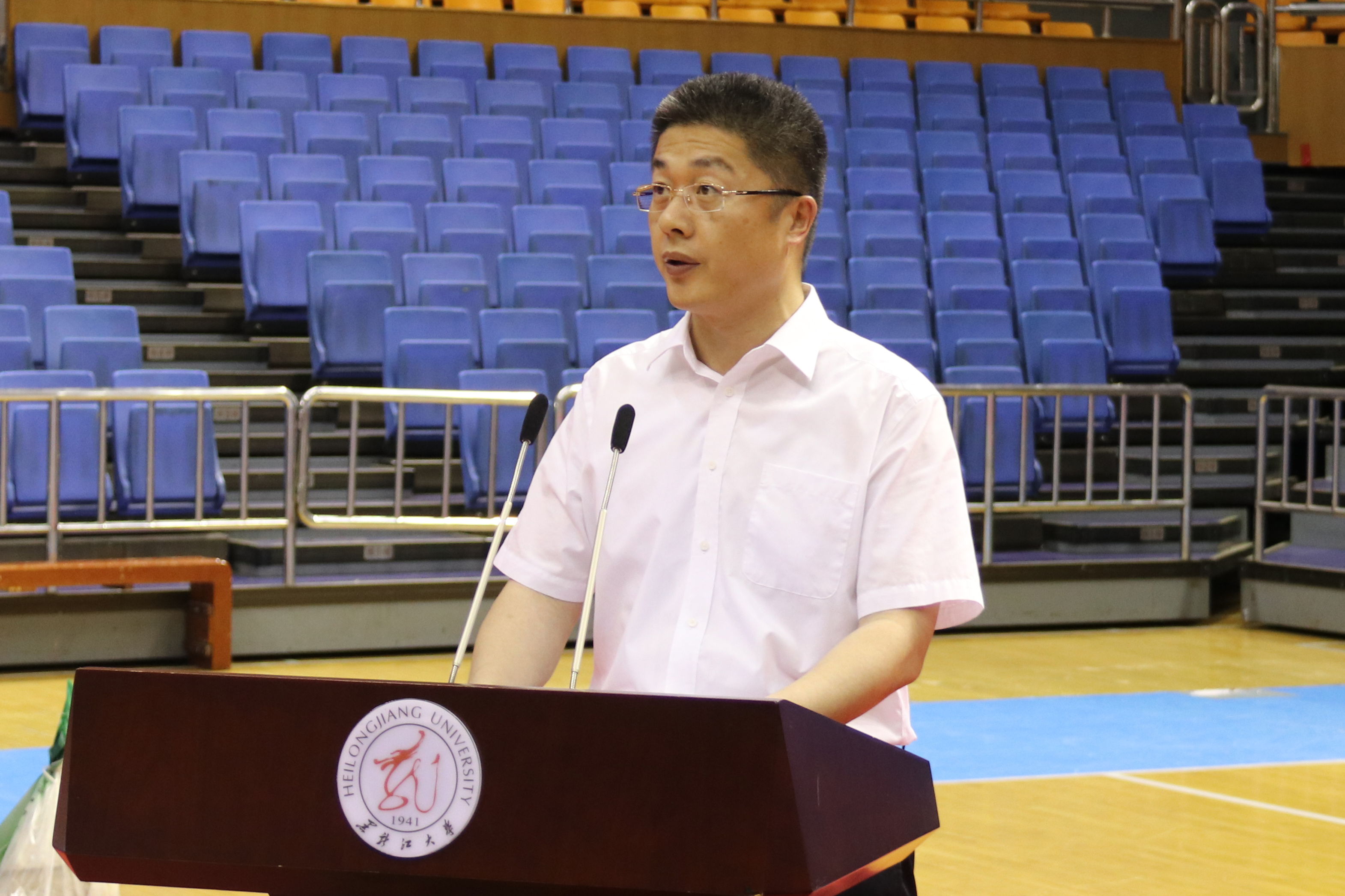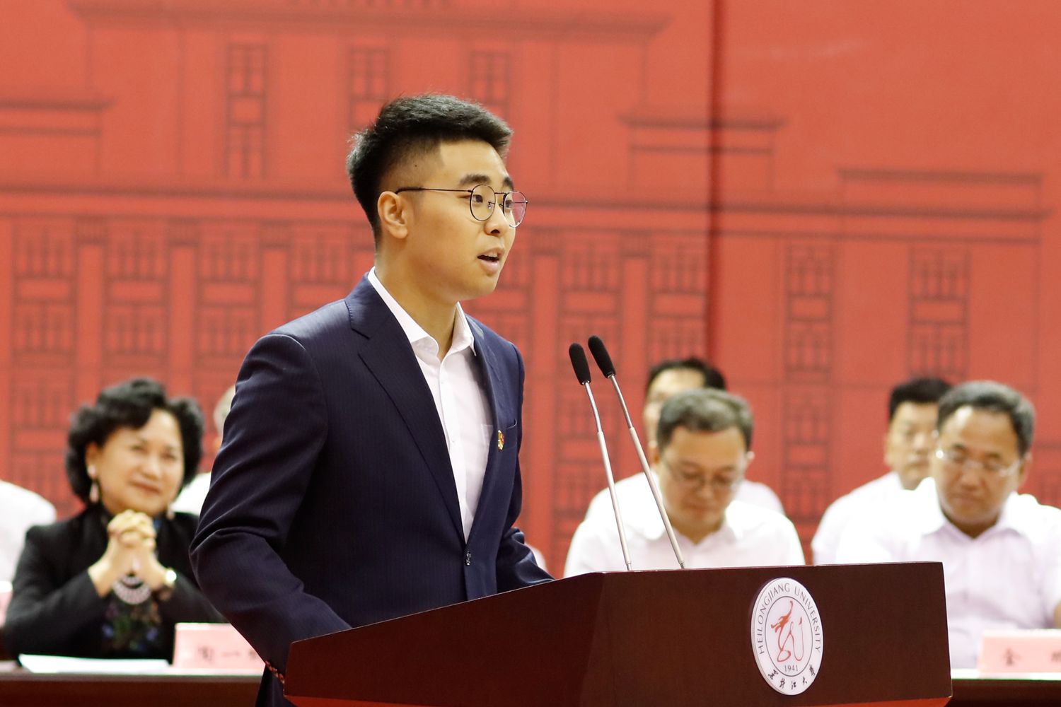2016级法学院许一博代表全体在校生向即将踏上全新人生旅途的学长学姐们表示热烈祝贺,他深情地说,你们是黑大的骄傲,是我们的榜样,衷心祝愿学长学姐们在实现中国梦的道路上乘风破浪、砥砺前行。