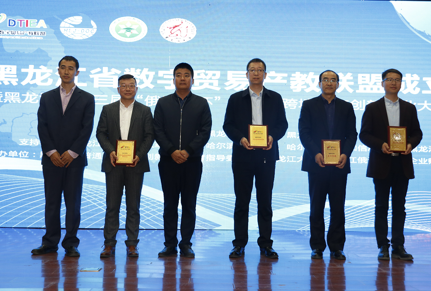 俄速通科技企业孵化器有限责任公司与我校、黑河学院、黑龙江职业学院、黑龙江农业经济职业学院、哈尔滨职业技术学院派遣代表,就教育部产学合作协同育人项目及产业学院筹建上台签约。