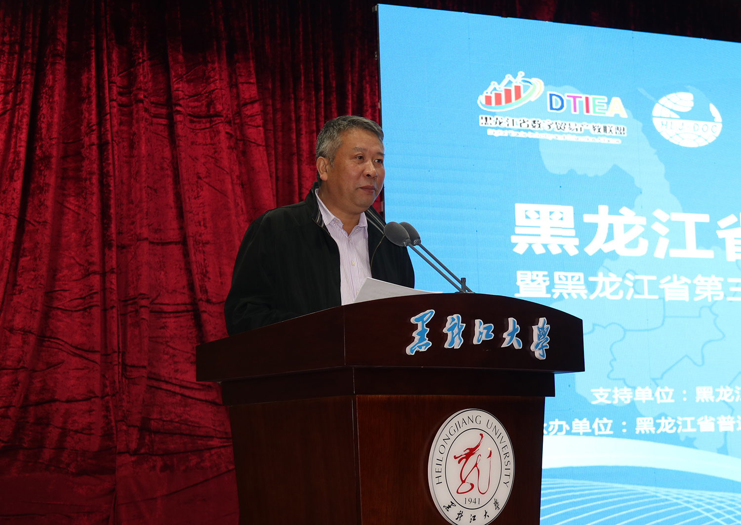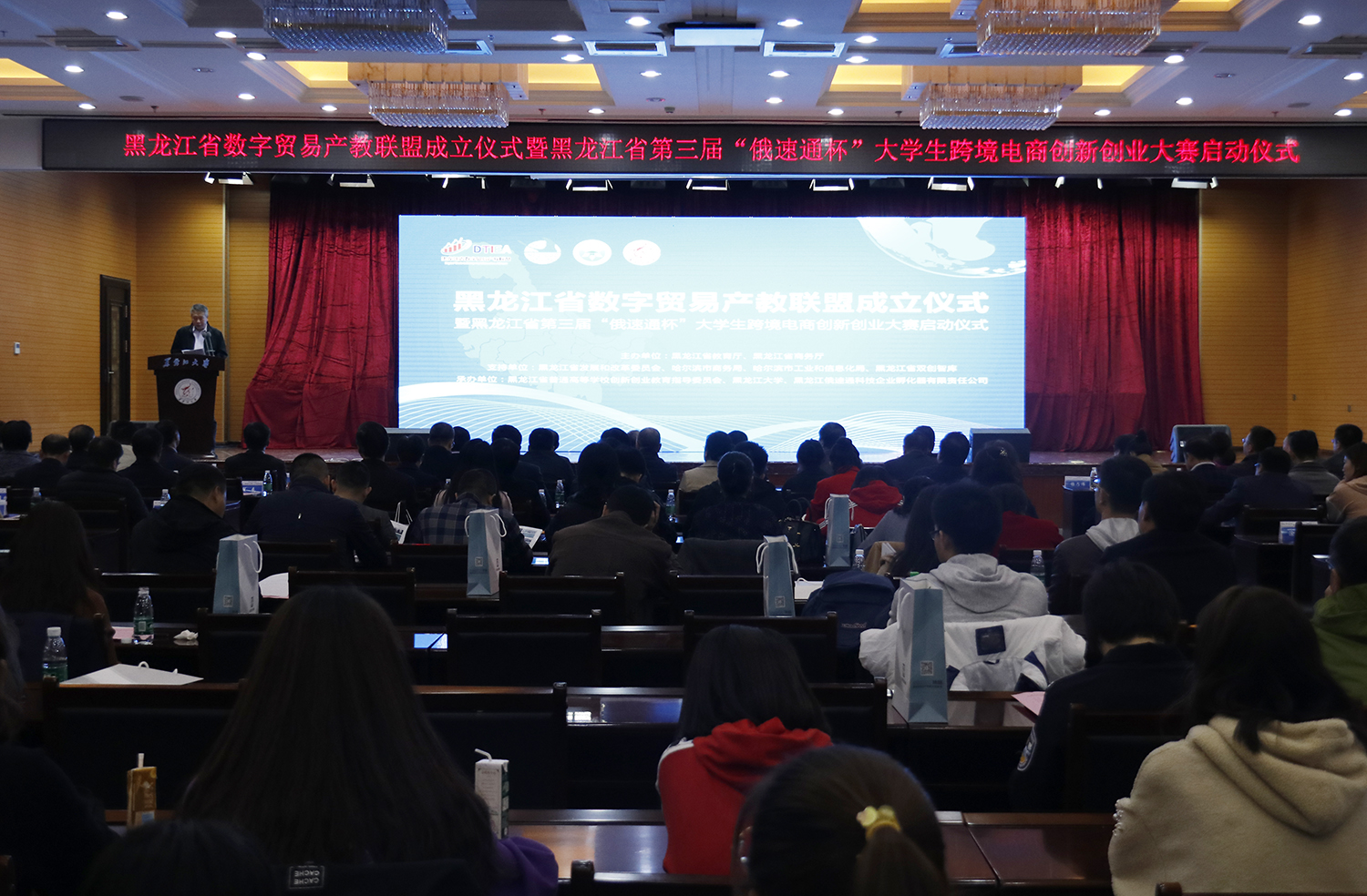 10月18日下午,黑龙江省数字贸易产教联盟成立仪式暨黑龙江省第三届“俄速通杯”大学生跨境电商创新创业大赛在我校启动。省教育厅副巡视员丁哲学、省发改委社会发展处处长杨乃伟、省教育厅高等教育处处长蒋鲲,我校校长付宏刚,省商务厅、市商务局、市工业和信息化局,全省普通高校校领导、学院负责人、创新创业教育负责人、社会企业代表及黑大师生代表等200余人参加启动仪式。我校教务处处长吴华洋主持启动仪式。