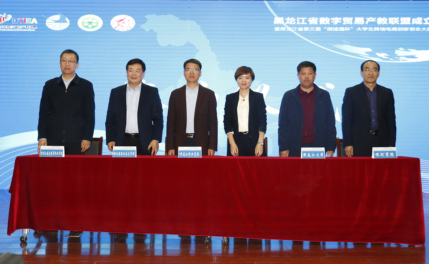 与会领导共同为黑龙江省数字贸易产教联盟揭牌,随后启动黑龙江省第三届“俄速通杯”大学生跨境电视创新创业大赛。
