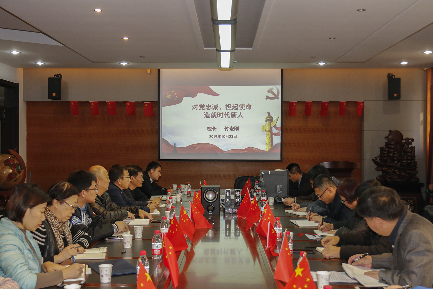 付宏刚校长阐述了习近平总书记关于“中国共产党人的初心和使命”、“教育事业发展”,特别是关于“培养什么人”、“怎样培养人”、“为谁培养人”三个问题的重要论述。他指出,习近平总书记关于教育的重要论述具有重大的政治意义、理论意义和实践意义,体系科学,内涵丰富,贯穿着坚定的信仰信念、鲜明的人民、强烈的历史担当、求真务实作风、勇于创新精神和科学方法论,需要我们深入学习贯彻,在推进学校各项事业发展特别是育人工作中坚守党的初心使命。他强调,习近平总书记在全国高校思想政治工作会议上指出,高等教育要为人民服务,为中国共产党治国理政服务,为巩固和发展中国特色社会主义制度服务,为改革开放和社会主义现代化建设服务。这是我们践行党的初心使命的直接检验。