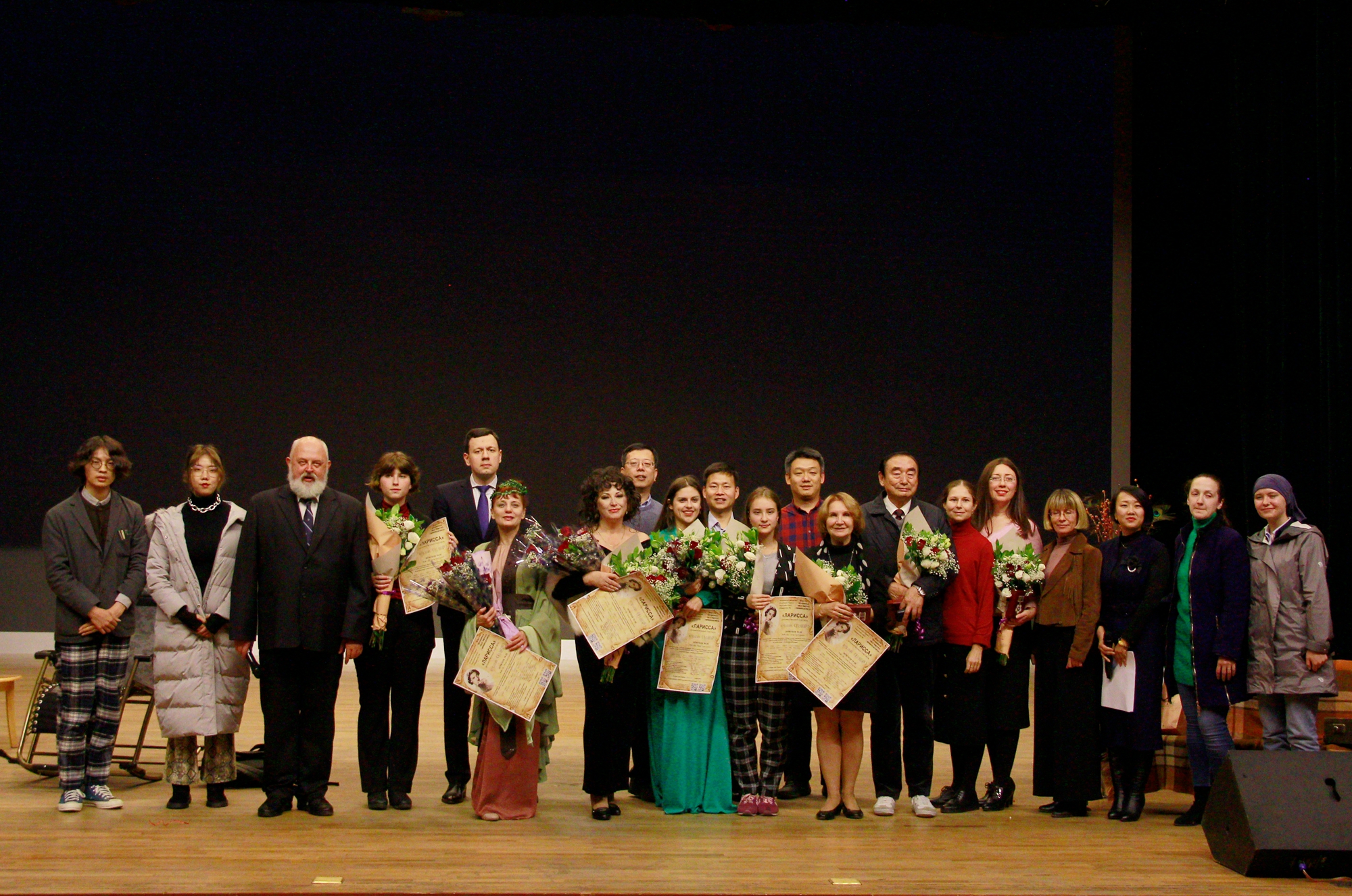 表演结束后,哈尔滨俄罗斯俱乐部历史部主任谢尔盖•尤列明代表符拉迪沃斯托克市老战士与劳动模范委员会及俄侨协会授予我校俄语学院院长孙超教授、编剧李延龄教授、“拉丽萨”合作编剧塔玛拉•卡丽别洛娃、“窗口”剧团团长维克多丽娅•瓦西里戈维奇中俄建交70周年纪念章,并为全体剧团成员献上鲜花。