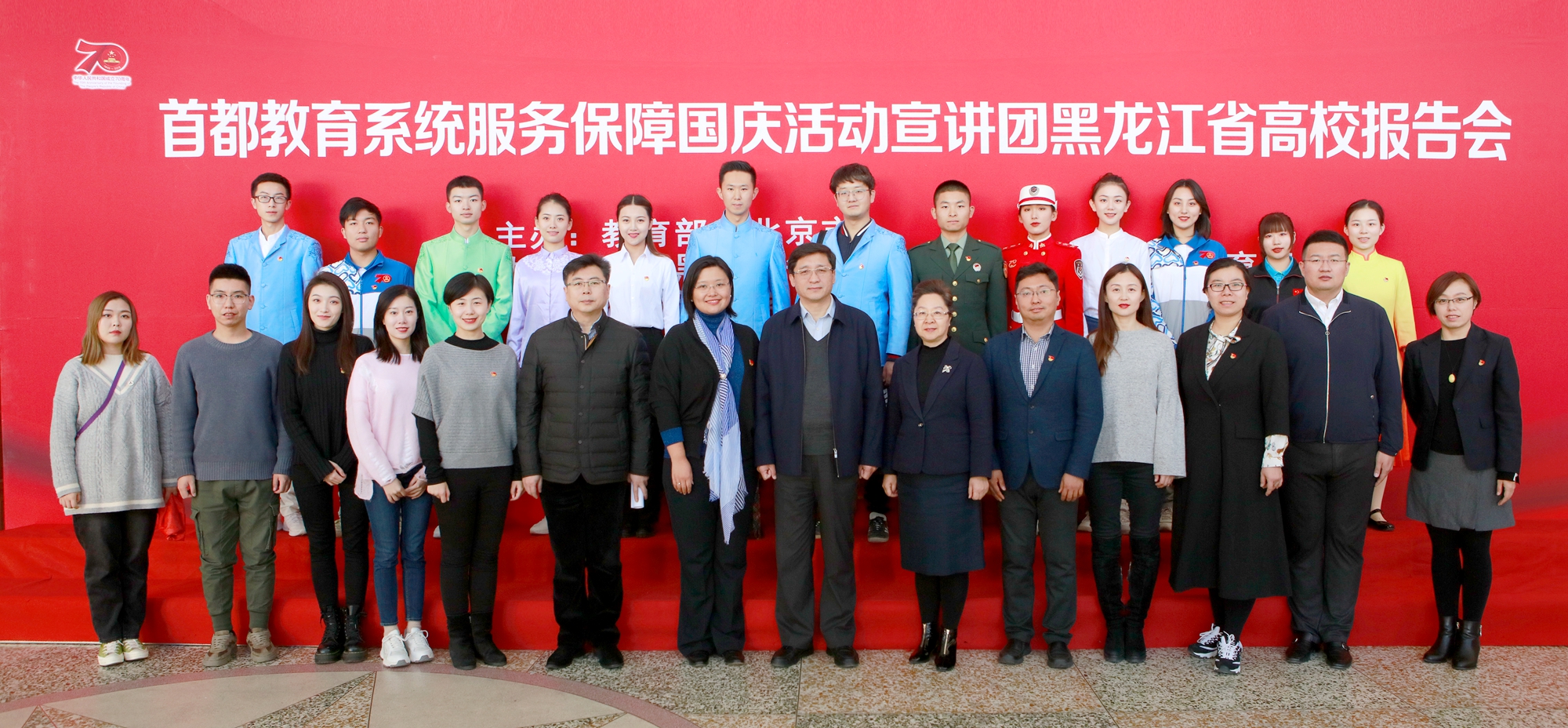 在新中国成立70周年系列庆祝活动中,首都教育系统9.6万余名师生在服务保障工作中作出重要贡献。为表彰首都教育系统在服务保障国庆活动中作出的重要贡献,教育部签署嘉奖令,号召全国教育系统向参与活动的首都高校及各类学校的师生学习。11月8日上午,首都教育系统服务保障国庆活动宣讲团黑龙江省高校报告会在HG8088皇冠举行,来自中国传媒大学、北京舞蹈学院的13名师生在我校音乐厅分享了他们参加国庆70周年庆典活动的感人故事。我校师生代表1000余人在现场参加了报告会,全省高校有6.9万名师生同时收看网络直播。省委教育工委委员、二级巡视员董成和我校党委副书记蒋晶洁会见了宣讲团成员并出席报告会。