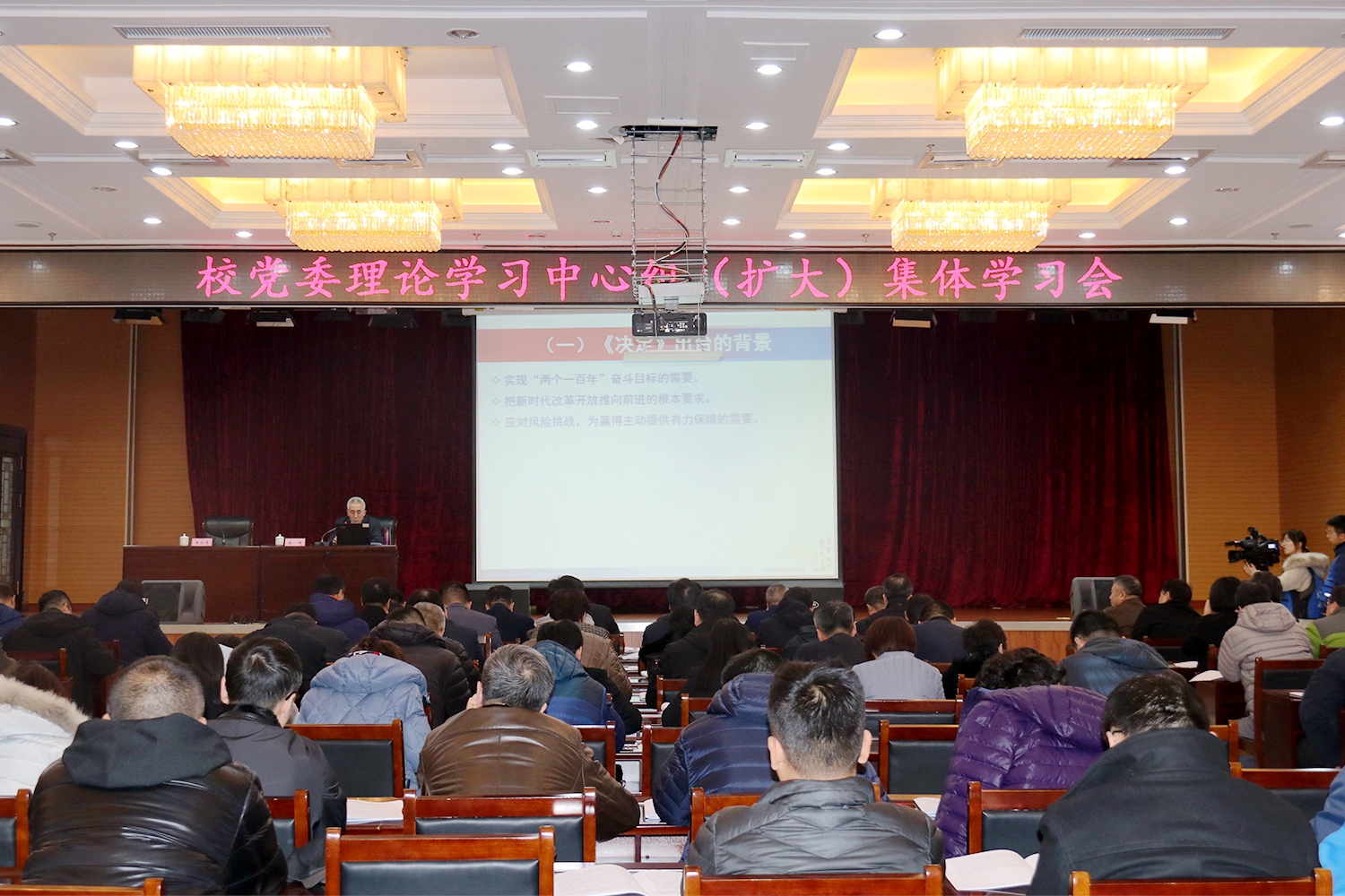 11月14日下午,我校在主楼一楼报告厅召开党委理论学习中心组(扩大)集体学习会。本次学习会结合主题教育跟进学习的要求,深入学习党的十九届四中全会精神。全体校领导、校党委委员、校纪委委员、全校中层干部参加学习会。校党委书记王永清主持学习会并发表讲话。