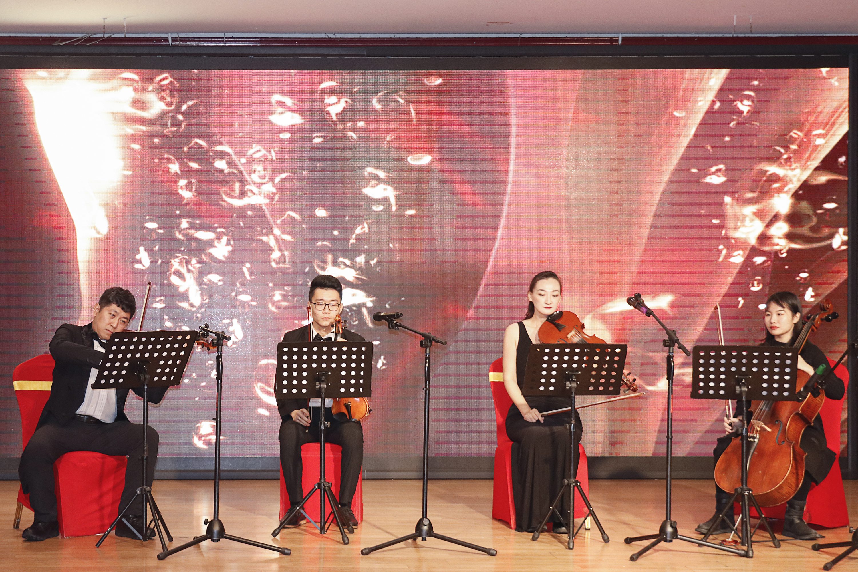 随后,由统战成员自编自演的文艺节目在小号重奏《号角》中拉开了序幕。三句半《追赶超越著新篇》、诗朗诵《读中国》回顾了中国人民雄壮前进的坚定步伐,为我们伟大的祖国深情献歌;弦乐《多瑙河之波圆舞曲》、长笛重奏《四季的问候》琴弦微颤、曲调悠扬,声乐演唱《玛依拉变奏曲》雄浑壮丽;旗袍秀《国色天香》为会场增添了一丝古典韵味;在古诗词吟唱的互动环节中,无党派人士、文学院副院长刘东影教授带领全场观众共同吟唱《诗经·周颂·丰年》,带观众重温了千年前的祭祀颂歌。《我爱你中国》、《大中国》等一首首动听的旋律,更是将现场气氛推向了高潮,文艺表演在女生二重唱《不忘初心》中圆满结束。(摄影:张茹悦 杨燕 周佳慧)