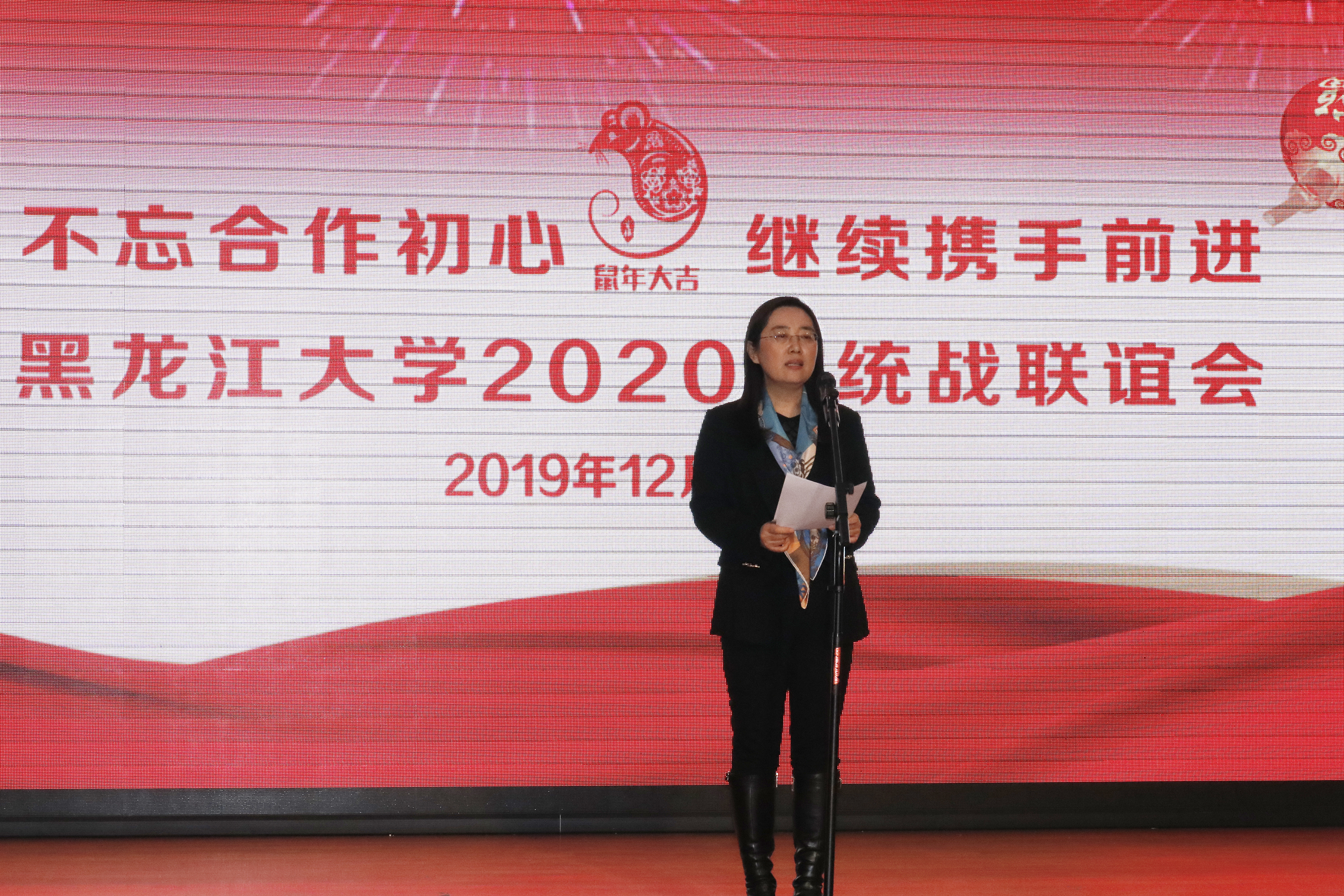 党委副书记丁宏在联谊会上致辞。丁宏代表学校党委和行政向一年来关心和支持统战工作的统战成员们致以节日的祝福。同时,向学校统战成员通报了学校一年来的发展建设情况及统战工作取得的收获。丁宏表示,2019年是我校统战工作收获颇丰的一年。今年上半年,学校独立设置统战部,并由党委常委担任统战部长,既体现了上级组织和学校党委对统战工作的高度重视,也充分说明了统战工作的重要地位与重要程度。她希望统战成员们在新的一年继续牢固树立“同心同德谋发展”的思想,主动担当作为、认真履行职责,传递正能量、发出好声音、展示新形象,用踏实的工作和实在的业绩共同推进学校各项事业的开展。