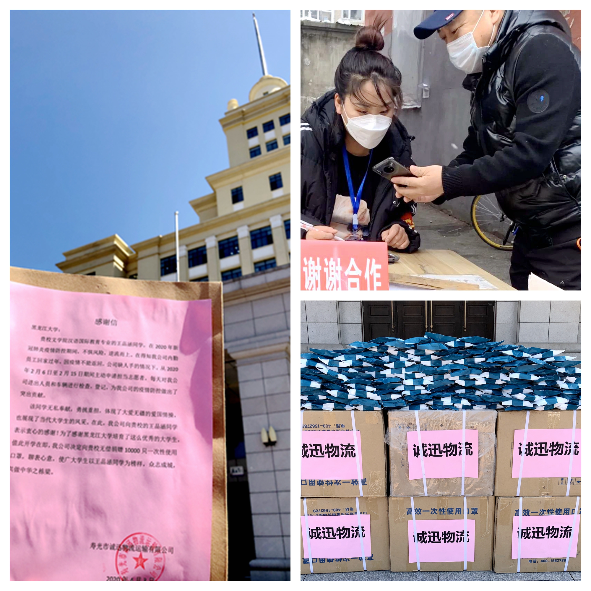 据了解,此次远在山东寿光的诚迅物流向我校捐赠防疫物资,这一慈善义举始于我校文学院2018级汉语国际教育专业学生王品涵“不惧风险,逆流而上”的战“疫”经历。感谢信中写到,王品涵同学在疫情防控形势十分严峻的情况下,主动申请担任志愿者,对该公司进出人员、车辆进行检查和登记,不仅为特殊时期企业正常运转贡献了力量,更以积极向上的精神风貌影响、激励了身边的人。诚迅物流高度赞扬黑大学子乐于奉献、勇挑重担的情怀和作为,感谢HG8088皇冠为国家、为社会培育英才。