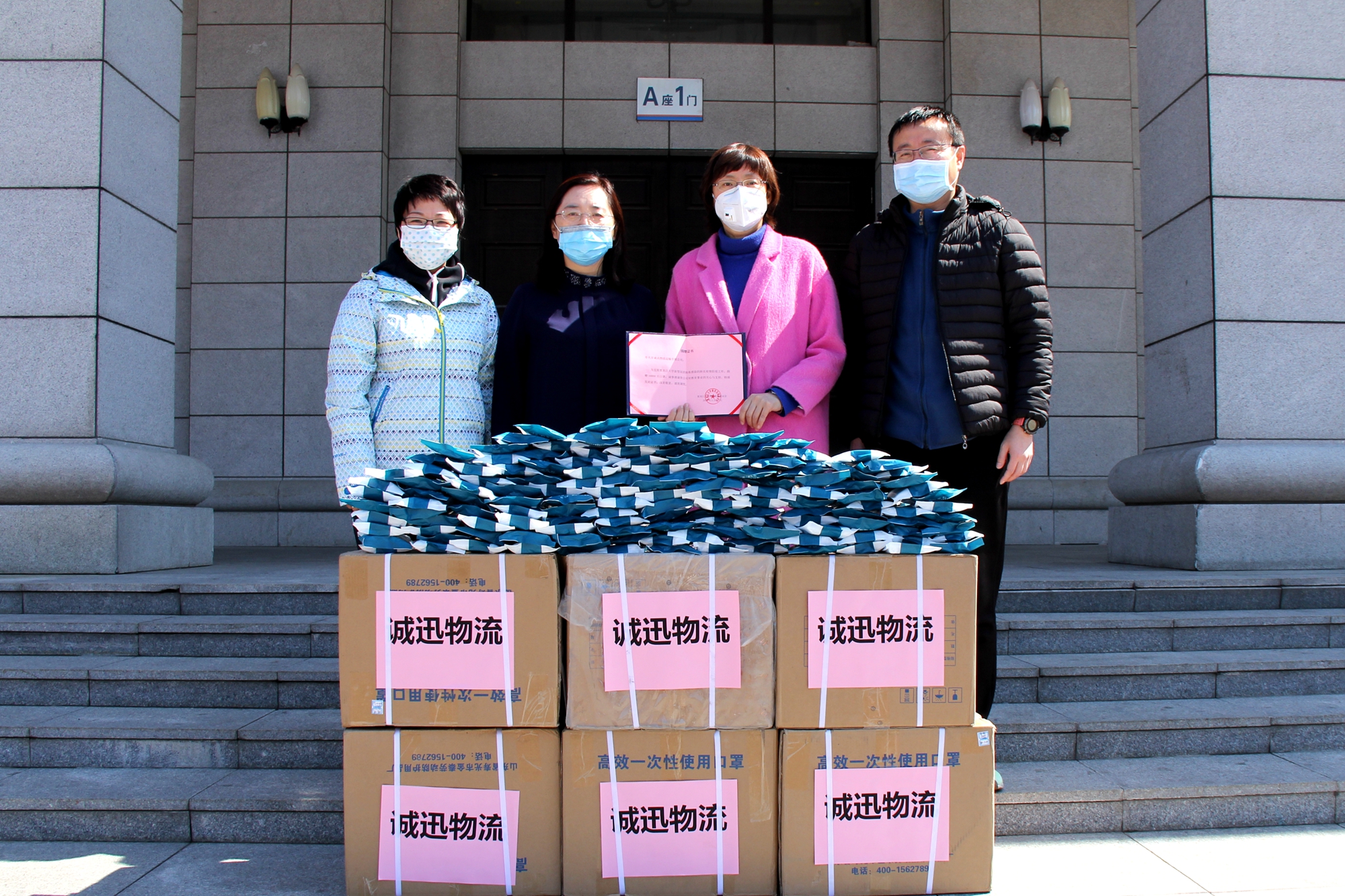 以感谢致以感谢,以奉献回报奉献。4月10日上午,一场特殊的捐赠仪式在我校主楼门前举行。校党委副书记丁宏代表学校向寿光市诚迅物流运输有限公司颁发捐赠证书,感谢他们向学校捐赠10000只一次性口罩用于新冠肺炎疫情防控。受诚迅物流运输有限公司委托,我校文学院党委书记宋烨接受捐赠证书。同时,她也将一封满含诚迅人热情褒扬与真挚情感的感谢信交到学校领导手中。学校办公室、教育发展基金会办公室、校医院等部门负责同志参加捐赠仪式。
