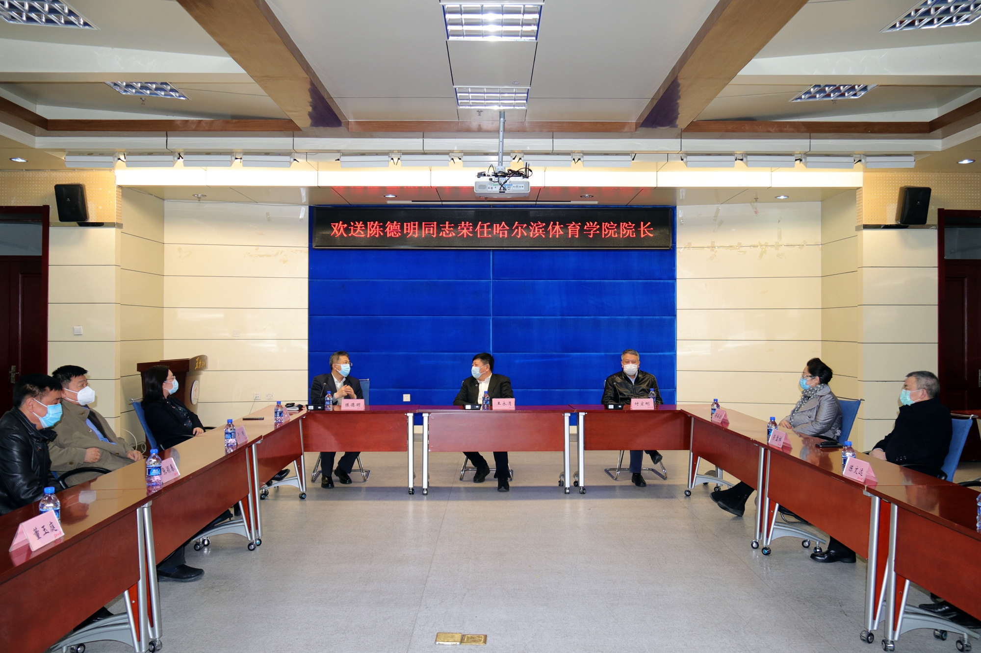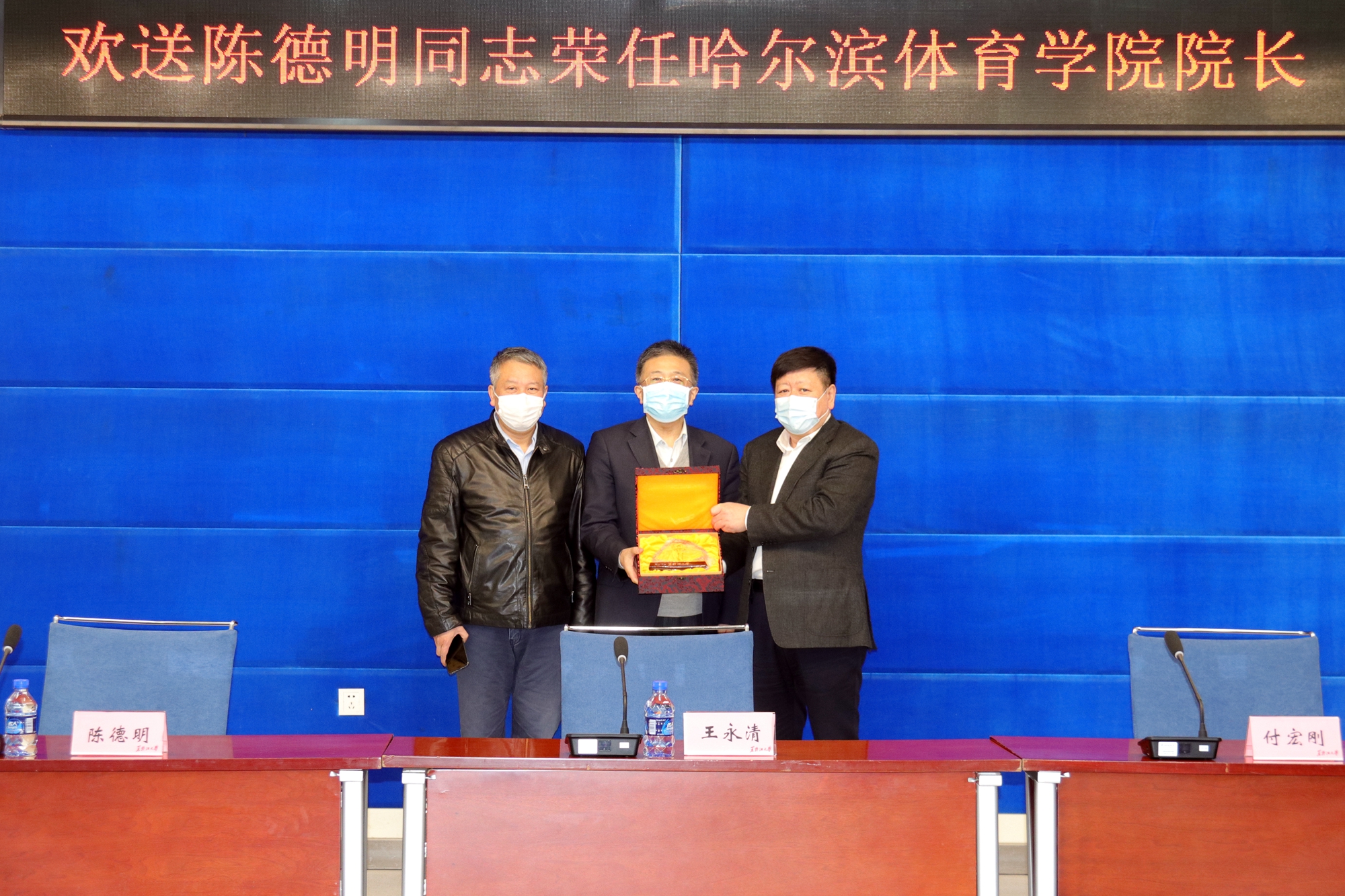 付宏刚校长对陈德明同志4年的扎实工作和辛勤付出表示感谢。他表示,在陈德明同志的带领下,学校的工会工作和民主建设取得了显著的成绩,留下了许多好的做法和宝贵的经验;在基地建设、专业建设等方面取得了标志性的成果,为学校体育事业的发展做出了贡献。希望学校与哈尔滨体育学院加强联系、紧密合作,互通有无、互相帮助,共同推进双方的建设与发展。