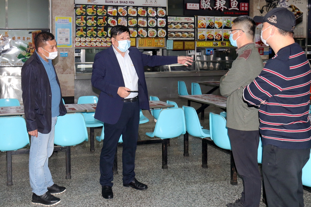 测温、扫码、就餐路线、排队间隔、座位安排……在学生食堂,王永清书记、陈文远副校长仔细检查了学生分散就餐措施落实情况,并走进后厨检查了环境卫生等情况,要求工作人员严格落实上级有关防疫要求,坚决减少人员聚集,防止出现交叉感染;利用食堂广播加强宣传引导,增强师生的自我保护意识;根据此次走流程情况做好应急处置预案,坚决阻止疫情在校园发生和蔓延。