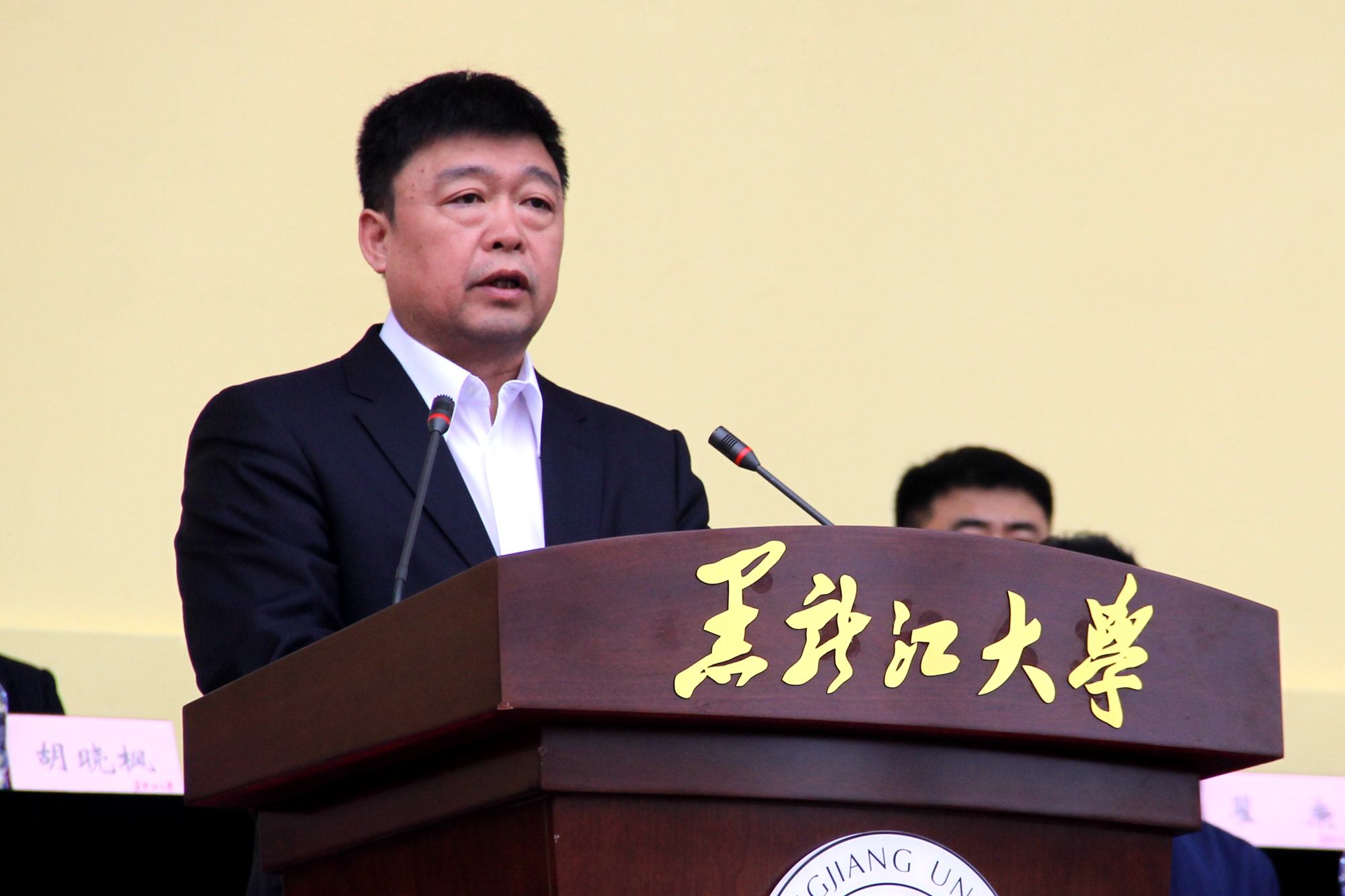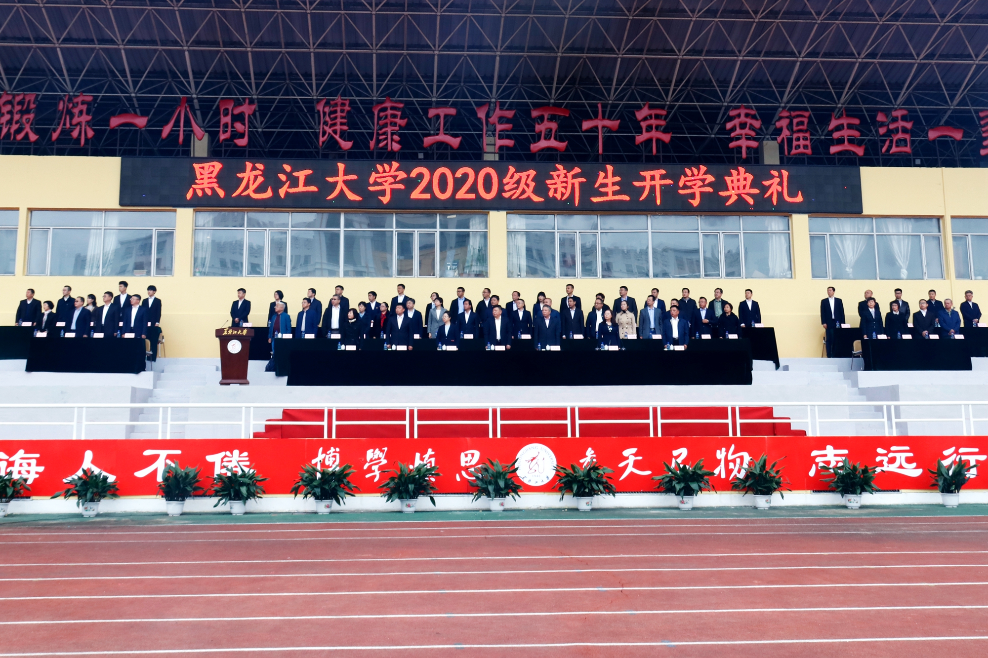 付宏刚校长在开学典礼上讲话。他代表学校全体师生员工,向2020级新生的到来表示热烈地欢迎和衷心地祝贺,并向含辛茹苦、辛勤付出的家长和老师致以崇高的敬意!他用“黑大是让人砥砺前行的地方”,“黑大是让人百炼成钢的地方”,“黑大也是让人施展才华的地方”,“黑大还是让人追梦筑梦的地方”四句话介绍了学校的历史及建设发展概况。