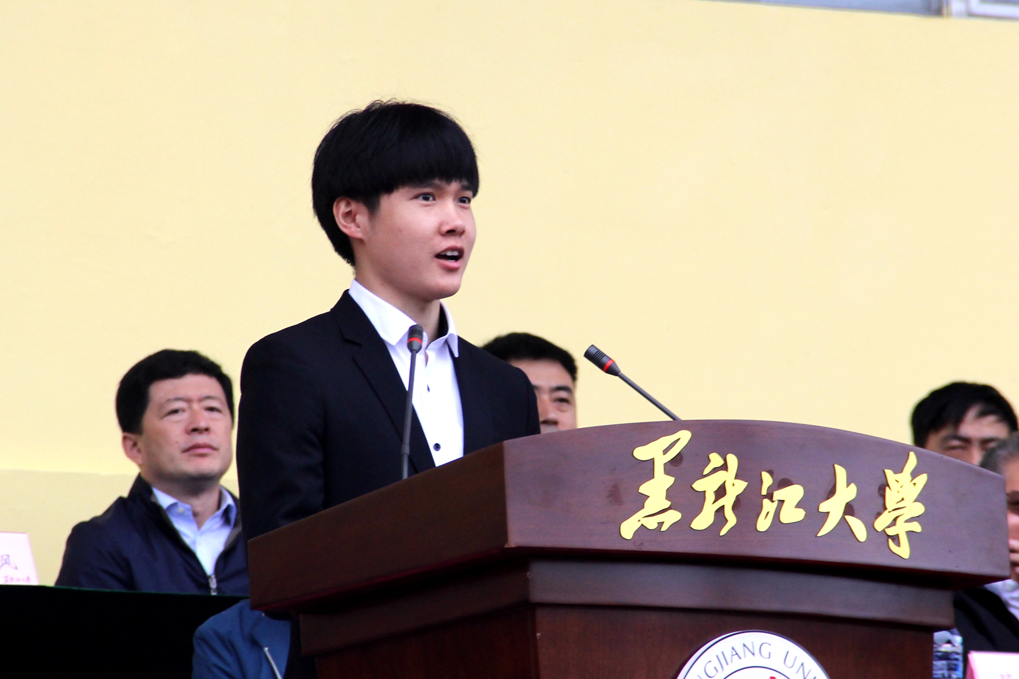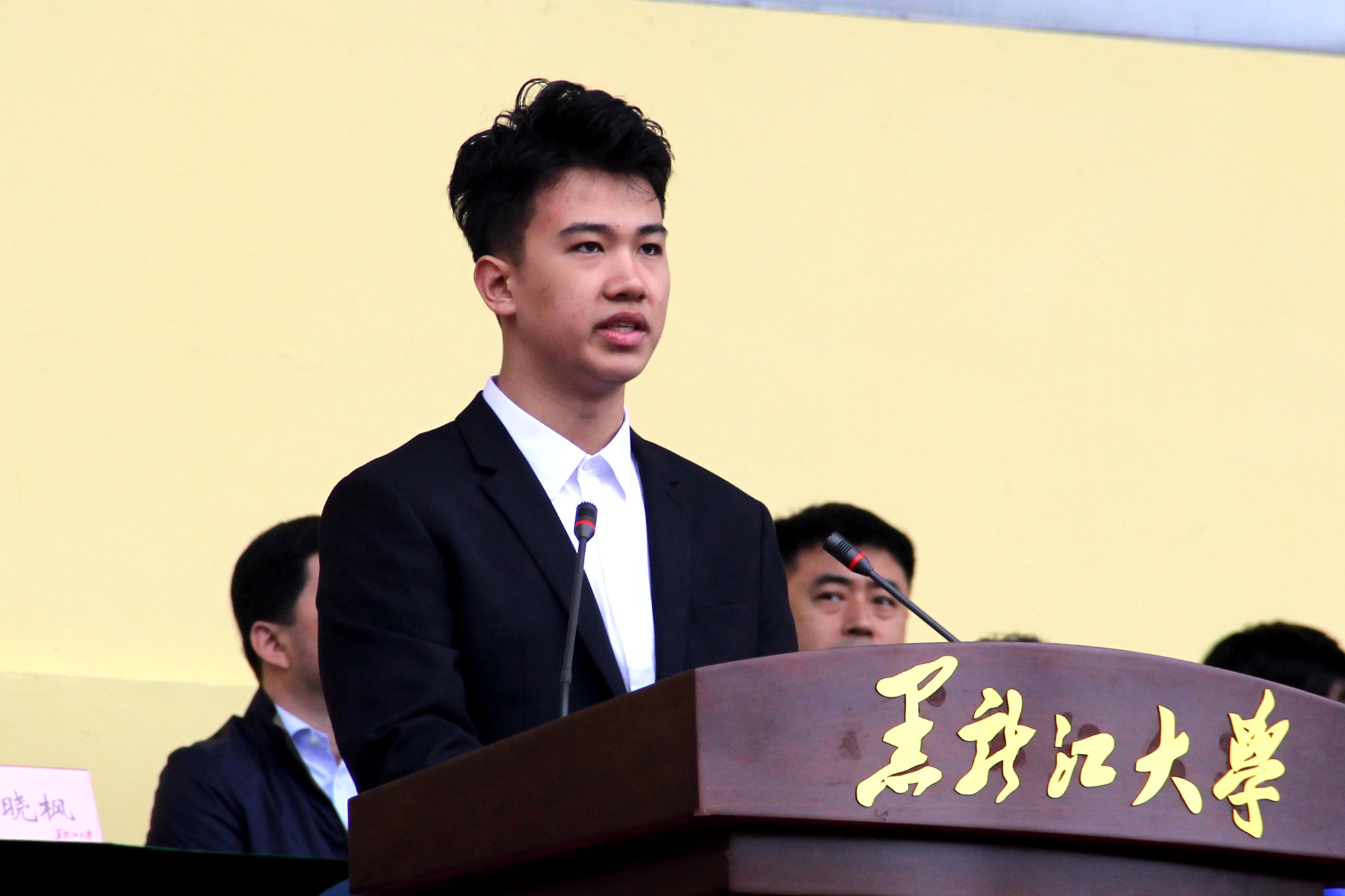 新闻传播学院2020级宋骏代表新生发言。他表达了对即将展开的大学生活的期待与憧憬,表示作为怀揣梦想的黑大学子,一定会在这片作育英才的沃土上携手并肩,以新时代青年特有的朝气活力为学校注入新的血液,用智慧和力量点缀青春,用拼搏和奋斗成就明天!