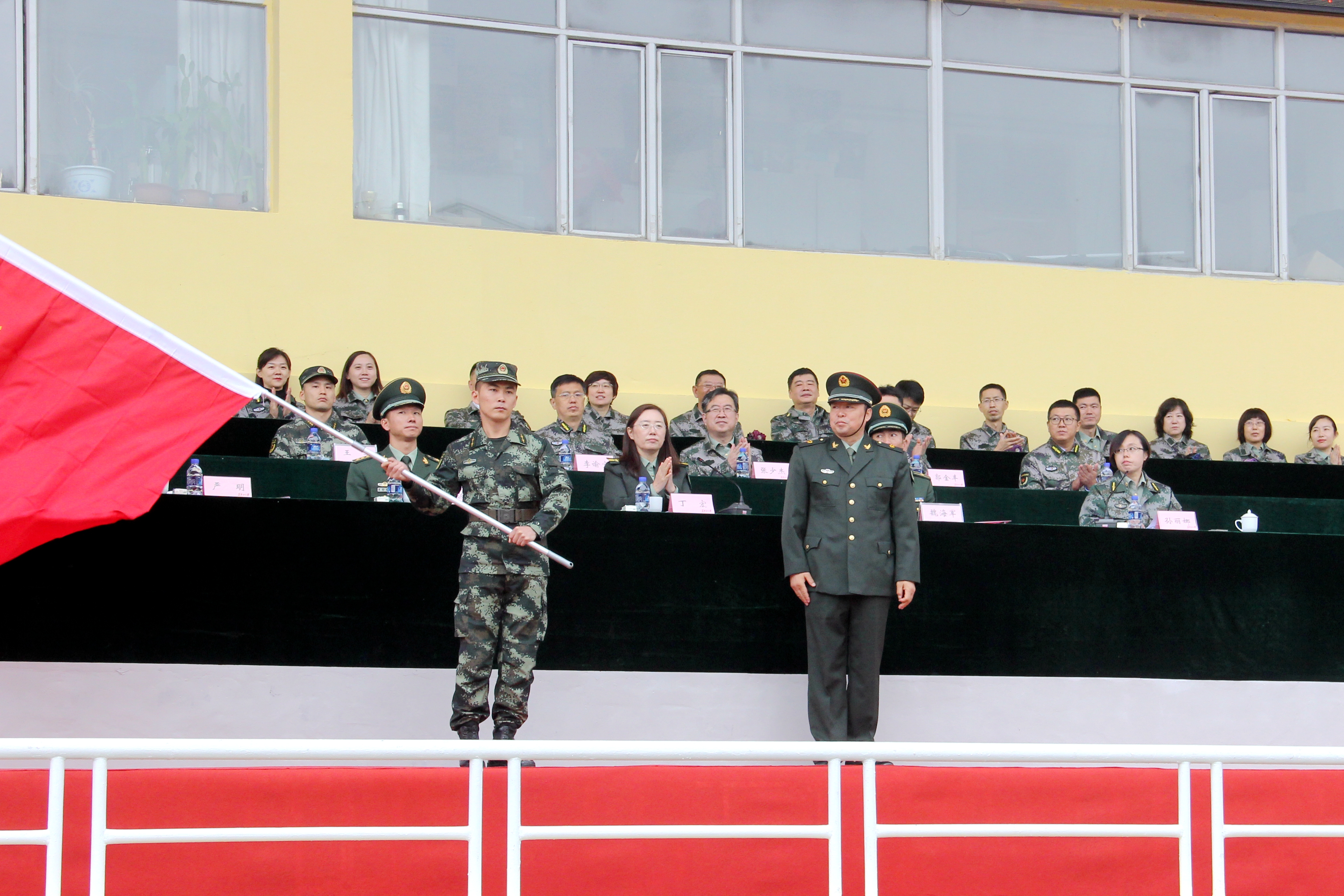 严明副校长为军训学生连队授军旗,军训教官代表接旗。